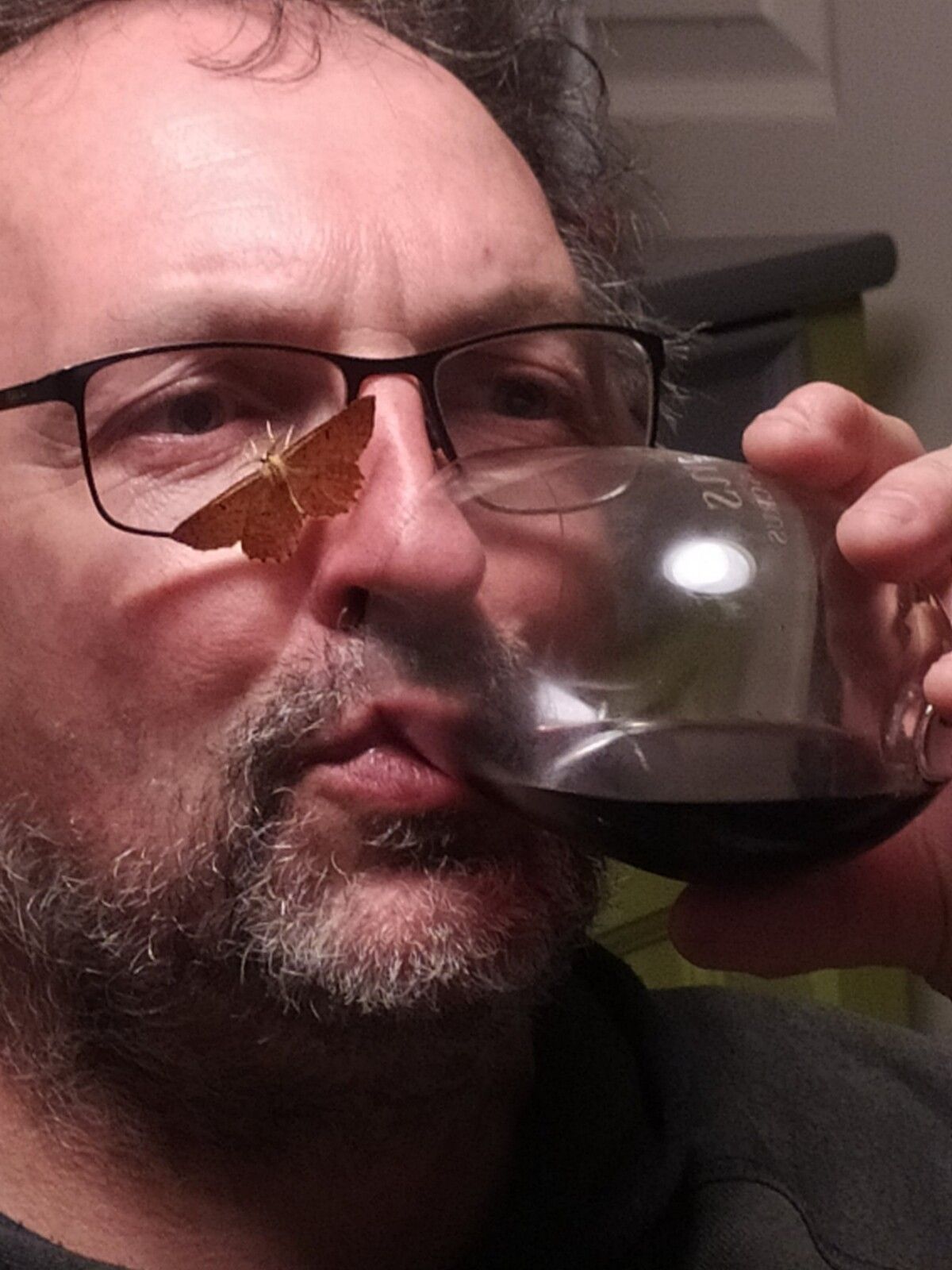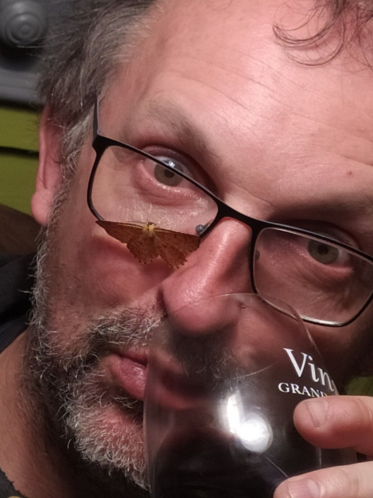 Mais c'est quand même étrange à une heure aussi tardive de voir ce lépidoptère errer sur les verres de lunettes d'un humain qui boit du vin rouge.